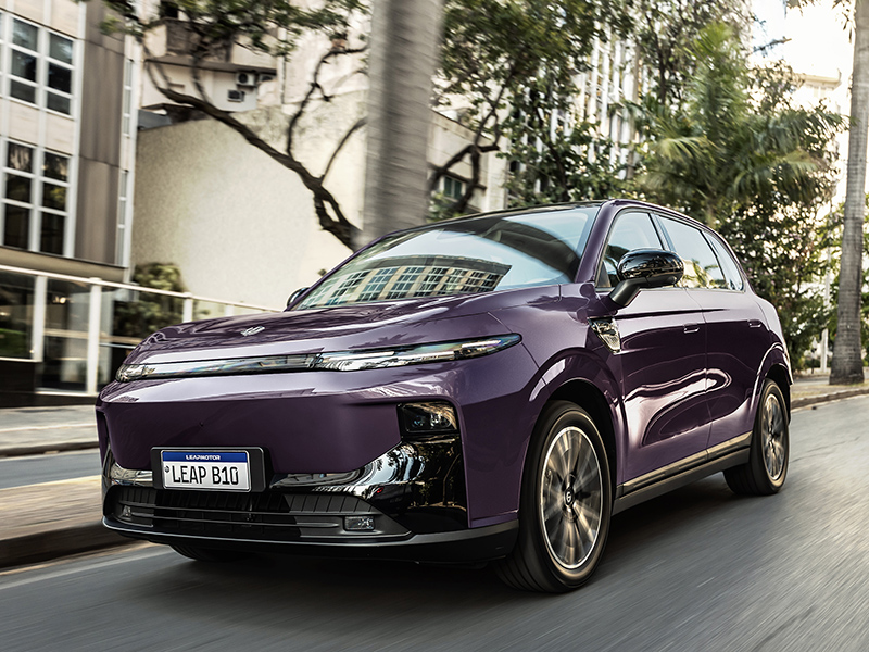 Leapmotor B10 atrai por desempenho e preço >> SUV elétrico médio-compacto B10 de tração traseira, segundo produto da parceria com a Stellantis, representa o modelo de volume da marca com foco em tecnologia e custo-benefício. Adota linhas limpas e futuristas, faróis e lanternas de LED em dois níveis e rodas de 18 polegadas. Internamente destaca-se pela sofisticação, sustentabilidade (materiais hipoalergênicos) e teto panorâmico, além de um bom porta-malas de 365 litros (VDA) e mais 21 litros na frente. Há soluções práticas como destravamento automático das portas por aproximação portando a chave.