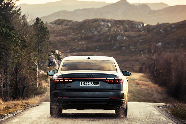 A carroceria do A8 segue o mesmo princípio do Audi Space Frame (ASF): é composta por 58% de peças de alumínio, combinada com paineis de ultra-alta resistência feitos de um polímero reforçado com fibra de carbono. Os faróis de LED Digital Matrix usam a tecnologia DMD (digital micromirror device). Cada farol tem aproximadamente 1,3 milhão de microespelhos que dividem a luz em minúsculos pixels. Isso permite que ele seja controlado com a máxima precisão.