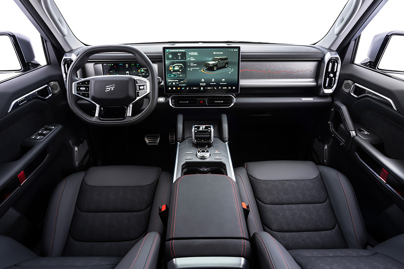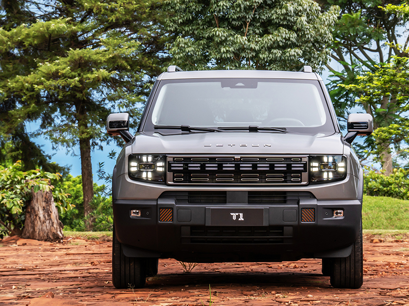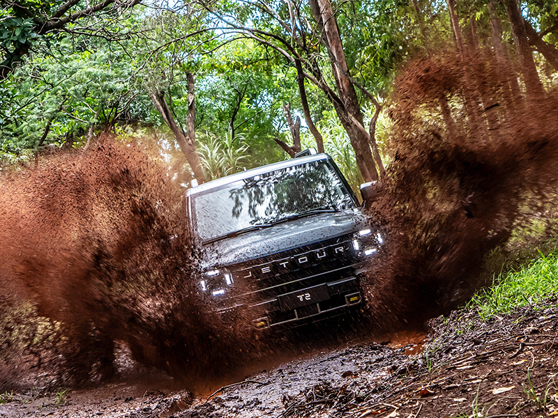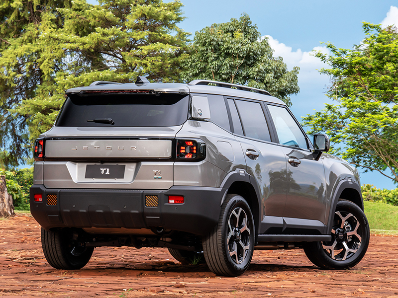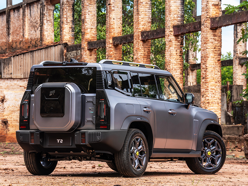 Jetour T2 >> Com uma arquitetura mais robusta e com verdadeira vocação off-road, o modelo T2 tem capacidade de reboque de até 1.600 kg. Híbrido plug-in, oferece construção estrutural reforçada, motor 1.5 turbo a gasolina (135 cv e 20,3 kgf.m) e mais dois motores elétricos adicionais. Com tração 4X4, entrega torque total de 62,2 kgf.m e acelera de 0 a 100 km/h em 7,5 segundos. Com carga completa na bateria de 26,7 kWh e tanque cheio com 70 litros, o T2 pode alcançar até 1.100 km de autonomia combinada em uso urbano.