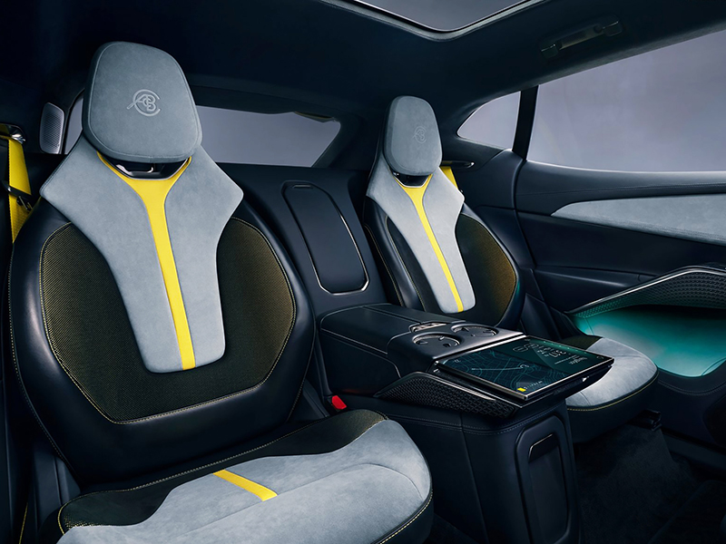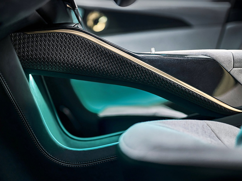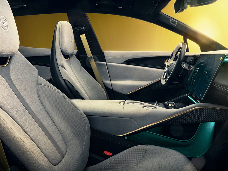 Os tecidos são reciclados e misturados com resina: o resultado é uma surpreendente aparência que lembra jeans desbotado e mármore. A Lotus oferecerá opções com quatro assentos individuais ou espaço para cinco pessoas com o banco traseiro inteiriço.
