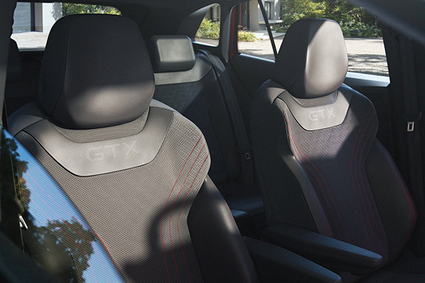 Costuras contrastantes em vermelho (um símbolo clássico de esportividade e força) adicionam realces aos bancos. O logotipo GTX aparece no volante, frisos da soleira, e de forma perfurada, na parte superior dos encostos dos bancos dianteiros.