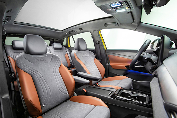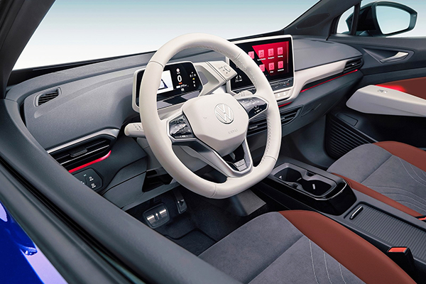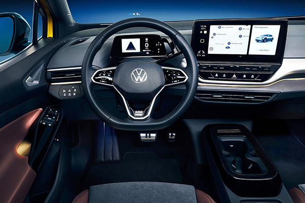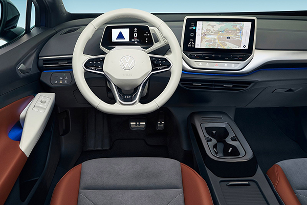 Por dentro, o novo Volkswagen apresenta amplo espaço e design moderno. O interior reflete o visual futurista do exterior, com funcionalidade quase totalmente controlada por toque ou controle de voz. O ID.Cockpit de 5,3 polegadas (display digital do motorista) substitui o painel de instrumentos tradicional e é operado com controles sensíveis ao toque no volante multifuncional revestido de couro.