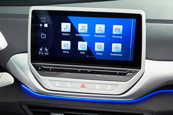 Três blocos mostram as informações mais importantes, com o visor para o status da bateria e o alcance abaixo. A alavanca de câmbio tradicional é substituída por uma grande chave oscilante à direita do ID.Cockpit e um painel de controle à esquerda do volante integra as funções de iluminação, incluindo faróis automáticos.