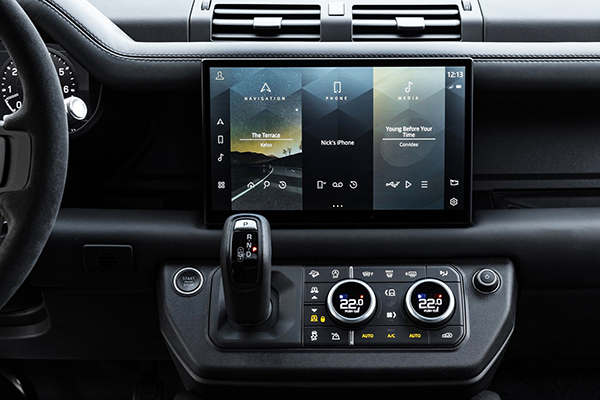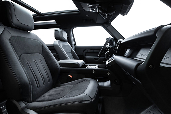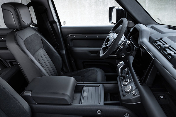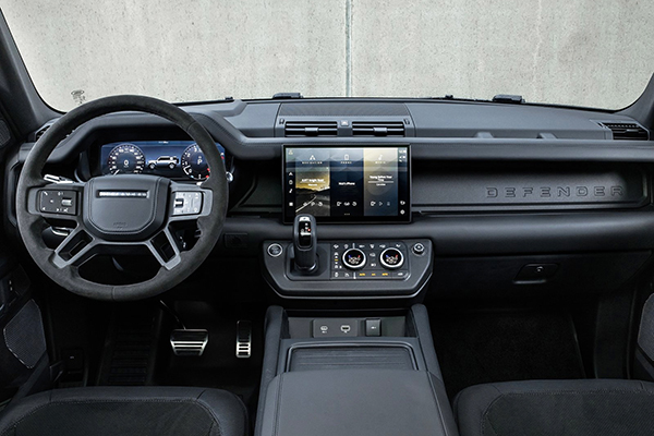 A paleta de cores é ofertada com as seguintes opções: Cinza Cárpato, Branco Yulong e Preto Santorini. O cinza e o branco oferecem possibilidade de teto de contraste em Preto Narvik. Por dentro, o Defender V8 apresenta assentos forrados com o exclusivo couro Ebony Windsor com tecido de camurça Dinamica e detalhes Robustec, enquanto a viga cruzada exposta do Defender tem um acabamento especial em Preto Cetim.