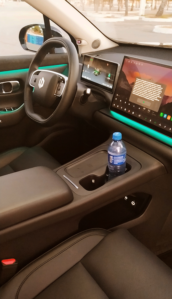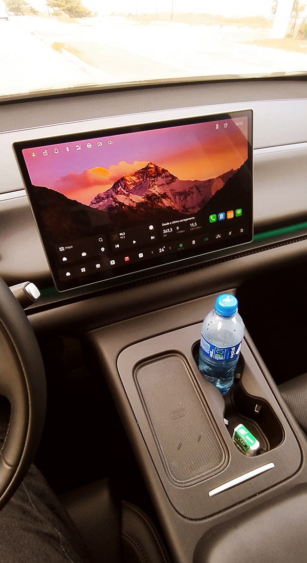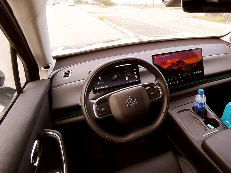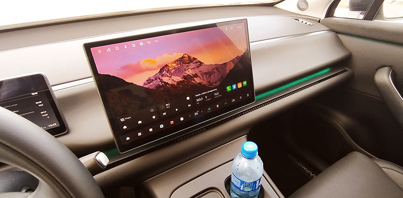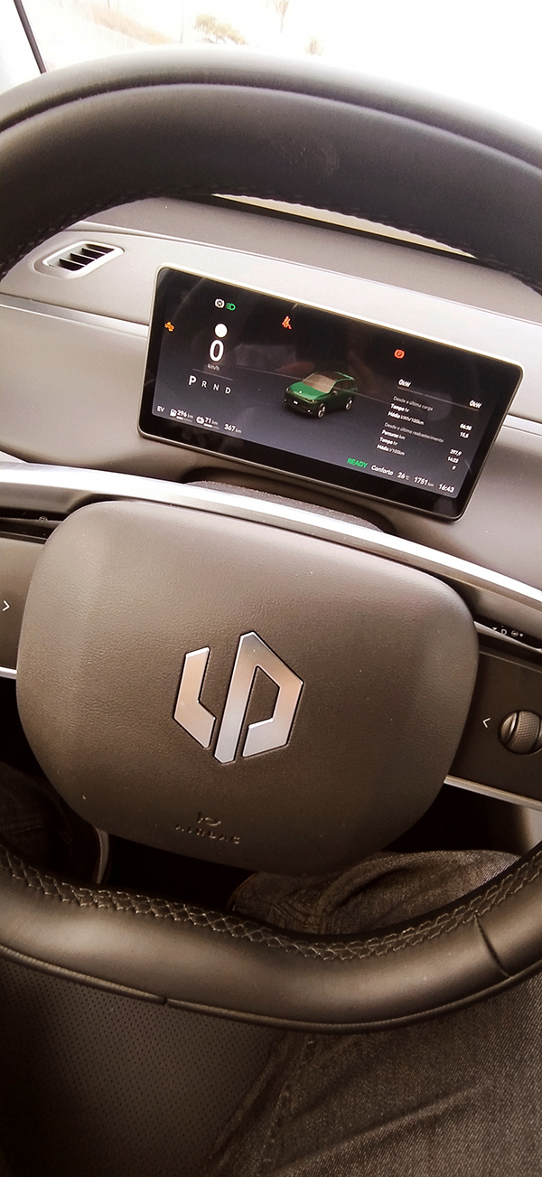 Muita tecnologia >> Praticamente todos os controles do SUV chinês C10 têm que ser executados pela tela central de 14,6 polegadas. É nesse momento, na quase total ausência de botões e teclas, que se apresenta a diferença entre um veículo tradicional a combustão e um automóvel elétrico e moderno, totalmente equipado com novas tecnologias. É preciso atenção e paciência para ler o manual de instruções (impresso e também digital, na própria tela do carro) e tentar mergulhar e entender os vários menus e submenus que existem naquele espaço digital retangular.