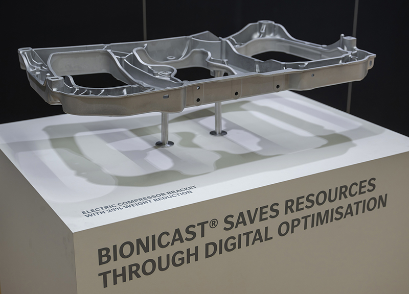 Bionicast® permite uso eficiente de material >> O Vision EQXX marcou a primeira utilização, pela Mercedes-Benz, de componentes fundidos desenvolvidos com uma abordagem inovadora de otimização biônica. Ela garante que o material seja utilizado apenas onde é necessário, tornando o componente mais leve e mais eficiente em termos de recursos. O método permite um design eficiente de componentes para desenvolvimento em série, levando em conta os requisitos de produção desde os estágios iniciais. Os primeiros componentes feitos com o processo Bionicast® estão em uso em veículos de produção, com outros a caminho. Em comparação com componentes convencionais, o processo pode proporcionar economias de até 25% em peso e material.