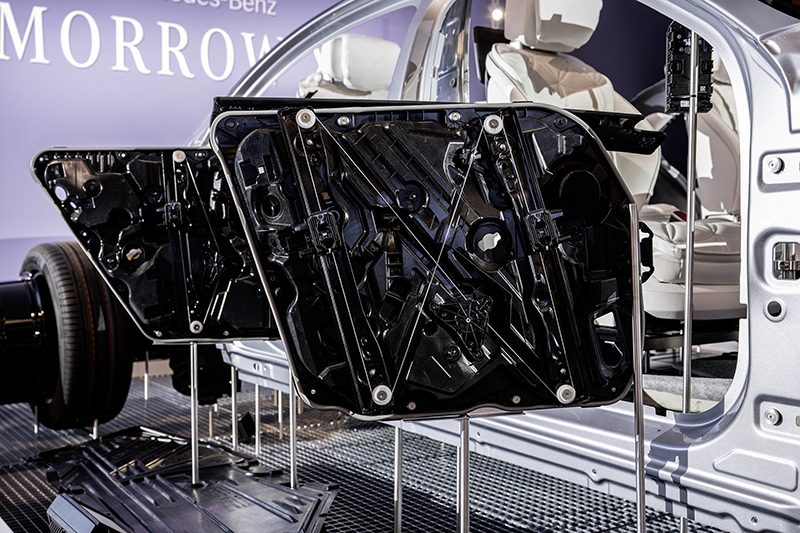 O futuro dos plásticos livres de fósseis >> O desenvolvimento de um módulo de porta inovador demonstra como a Mercedes-Benz pode reduzir o uso de matérias-primas fósseis ao empregar polipropileno de base biológica, plásticos reciclados, alumínio com alto teor de sucata e materiais produzidos a partir de CO?, mantendo desempenho e qualidade. Com pegada de carbono cerca de 30% menor, o componente reforça a importância de avaliar tecnologias sustentáveis e impulsiona a transição para plásticos livres de fósseis, movimento apoiado pela adesão da marca à Renewable Carbon Initiative (RCI) para acelerar o uso de fontes renováveis de carbono na produção automotiva.
