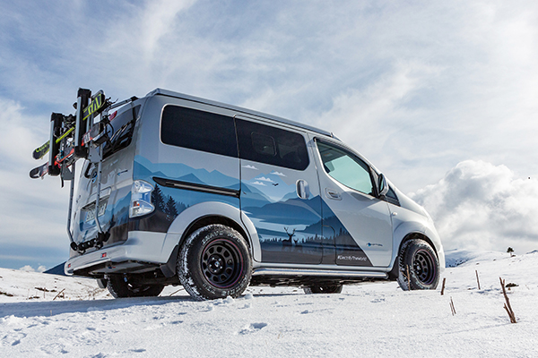 Uma série de ajustes ajudam o e-NV200 Winter Camper a superar as difíceis superfícies da estrada. Os pneus off-road premium e a altura de rodagem aumentada fornecem tração e distância do solo ideais na lama ou na neve. Faróis de neblina duplos montados em uma barra de aço reforçada na frente garantem visibilidade máxima. Baseada na e-NV200 Evalia, a e-NV200 Winter Camper se beneficia da comprovada tecnologia do trem de força elétrico da Nissan. A unidade fornece potência e alcance otimizados, com torque e aceleração instantâneos. Os modos B e ECO de economia oferecem frenagem regenerativa aprimorada e consumo mais eficiente, respectivamente. (Divulgação: Nissan / Instagram: @acelerandoporai.com.br)