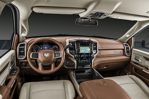 Extremamente espaçosa e bem acabada, a cabine da Ram 2500 Laramie oferece muito luxo e tecnologia, a exemplo da central multimídia com tela de toque de 12 polegadas e inúmeros recursos. Entre os destaques estão a câmera 360°, a exclusiva câmera de caçamba e o sistema de som premium Alpine com nove alto-falantes, um subwoofer e cancelamento ativo de ruídos externos.