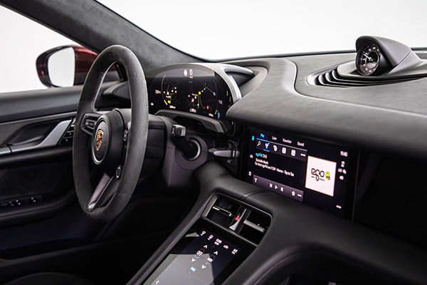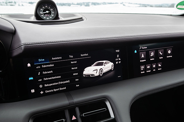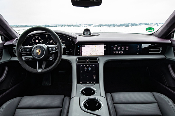 A cabine do Porsche Taycan sinalizou o início de uma nova era em 2019 com sua estrutura clara e com arquitetura completamente nova. O conjunto de instrumentos curvo independente forma o ponto mais alto do painel. Isso coloca um foco claro no eixo do driver. Outros elementos incluem um display central de infoentretenimento de 10,9 polegadas e um display opcional para o passageiro da frente.