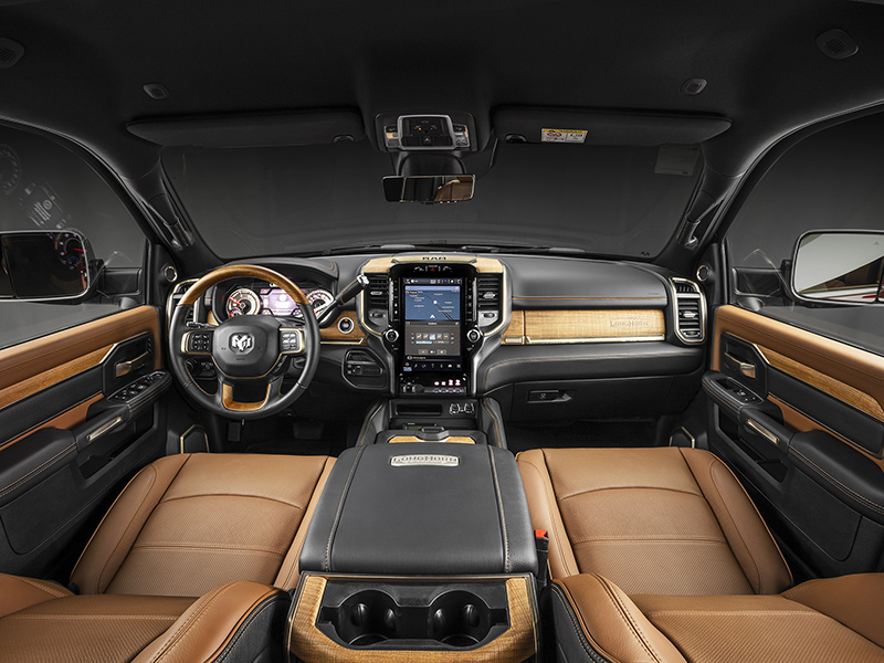 RAM 3500 Limited Longhorn (R$ 529.990) >> Todos os itens das duas primeiras versões da gama (exceto acabamentos externos e internos escuros ou na cor da carroceria da Laramie Night Edition) mais: faróis Full LED Matrix (direcionais); grade e rodas com desenho exclusivo; ganchos de reboque e molduras das janelas com acabamento cromado; revestimento marrom e preto em couro Natura Plus; acabamentos internos com madeira legítima; tapetes especiais; emblema da versão no console central e opção de pintura two-tone (Branco Pérola com Marrom Walnut). (Fotos: divulgação RAM / Instagram: @acelerandoporai.com.br)