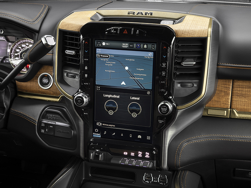 RAM 3500 Laramie (R$ 484.990) >> Sistema multimídia Uconnect com tela de 12 polegadas; câmera 360°; câmera de caçamba; retrovisor eletrocrômico; som premium Alpine de 10 alto-falantes e 1 subwoofer; cancelamento ativo de ruído; estribos laterais de porta a porta (dão acessos extras à caçamba); controle eletrônico de freio do reboque; faróis Full LED; comutação automática dos faróis; controle de velocidade de cruzeiro; monitoramento de pontos cegos; bancos em couro e tecido Alcântara; console central modular com 39 litros de volume e sobretapetes de borda elevada.
