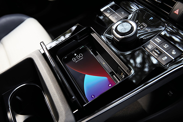 A tela sensível ao toque tem 12,3 polegadas de tamanho e o console também oferece sistema de carregamento de celular por indução (sem fio). Além disso, via aplicativo no celular, é possível ativar o ar-condicionado e travar ou destravar as portas remotamente.