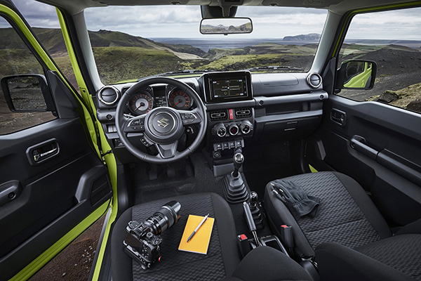 Por dentro, o Jimny Sierra traz sistema multimídia de 7” compatível com Apple CarPlay e AndroidAuto e ar-condicionado é digital e automático. O interior prioriza a praticidade com materiais duráveis, fáceis de limpar e resistentes a riscos.