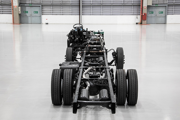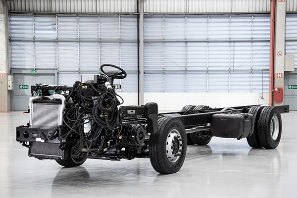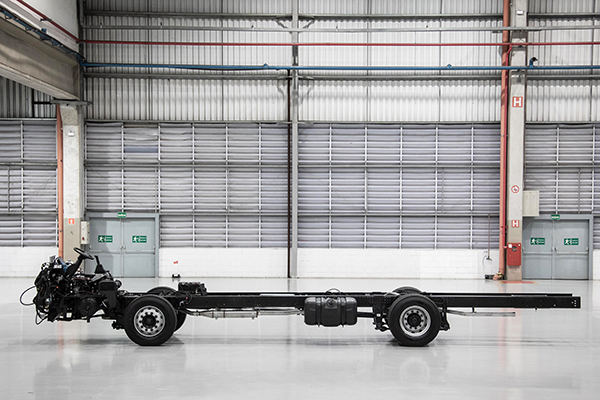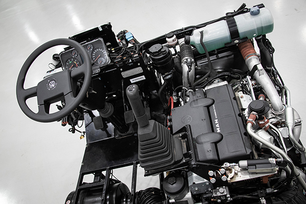 O chassi é equipado com motor MAN D08, com 186 cv e 71,3 kgf.m de torque e a transmissão manual ZF de sete marchas (seis marchas à frente e uma ré) é associada ao sistema de cabos e auxílio pneumático, garantindo trocas leves e precisas.